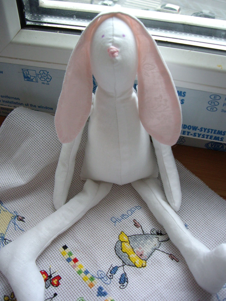 Пункт первый - Зайчиха. Росточком она около 50 см. Сама из флиса, набита холофайбером. На ней розовое платье с красной нижней юбкой, сшитое по МК Ирины Кунах